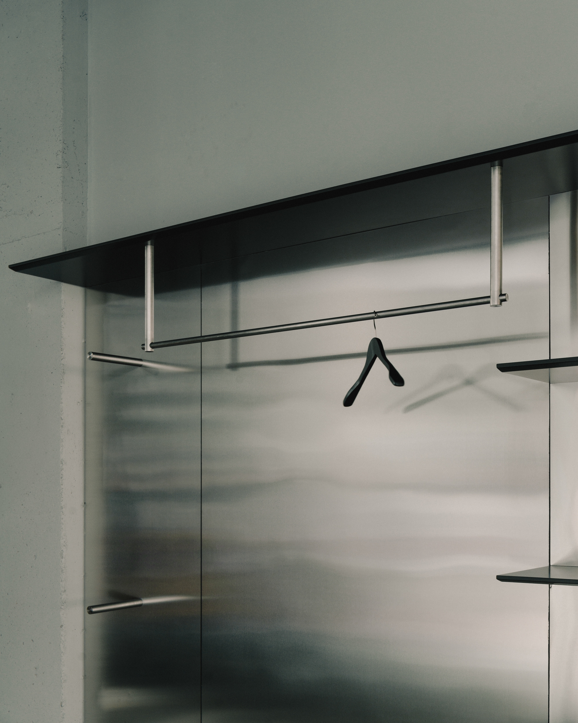 The interior design concept is based on simple geometric shapes, a monochrome color palette, and metal textures. Cooler tones and minimalist material combinations help highlight the products and present them clearly to visitors.