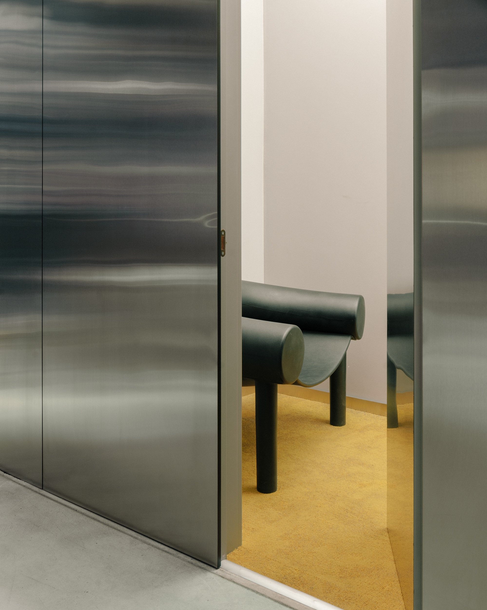 To add small accents, warm yellow tones are used in the fitting rooms and on modular furniture. This color complements the overall palette and balances the cooler tones of the space.